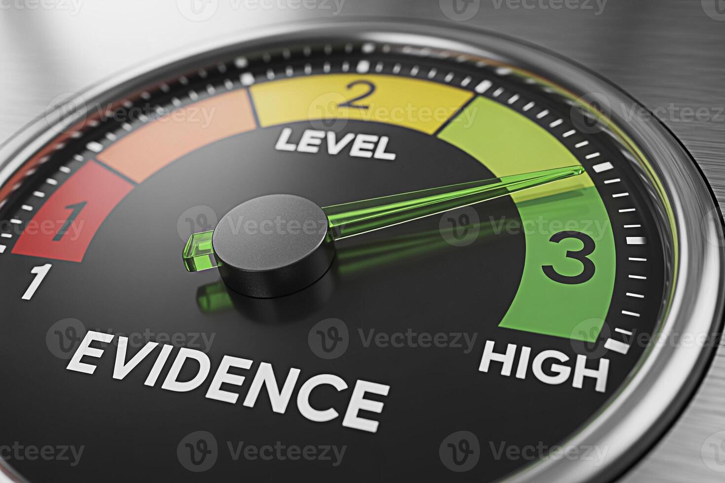 Closeup of an evidence level gauge indicating a high level of proof and validation set against a brushed metal background conveying a sense of accuracy reliability and confidence in research and data Pro Photo