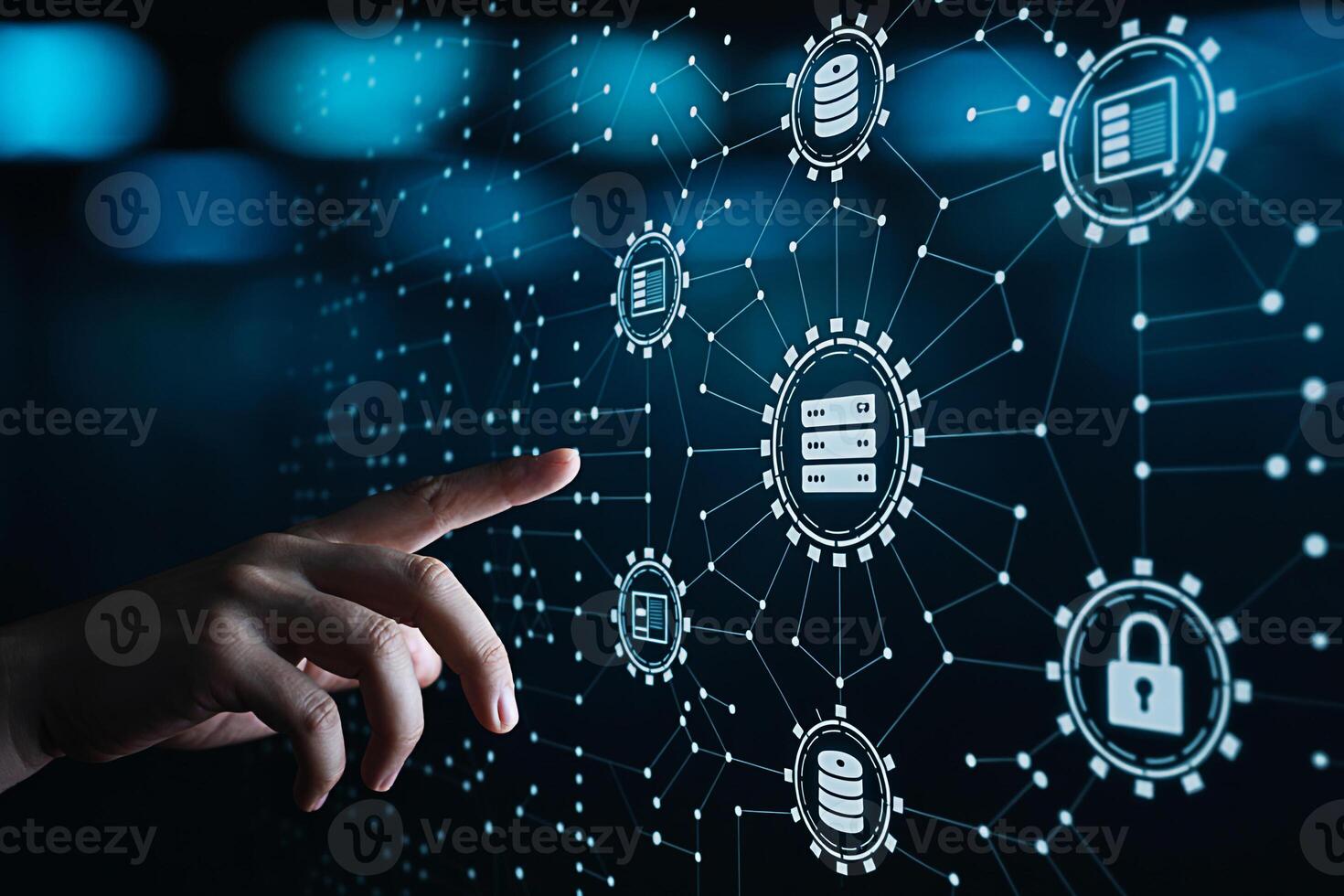 A hand interacts with a futuristic interface displaying database icons and network connections in a digital environment representing data management cybersecurity and innovative technology solutions Pro Photo