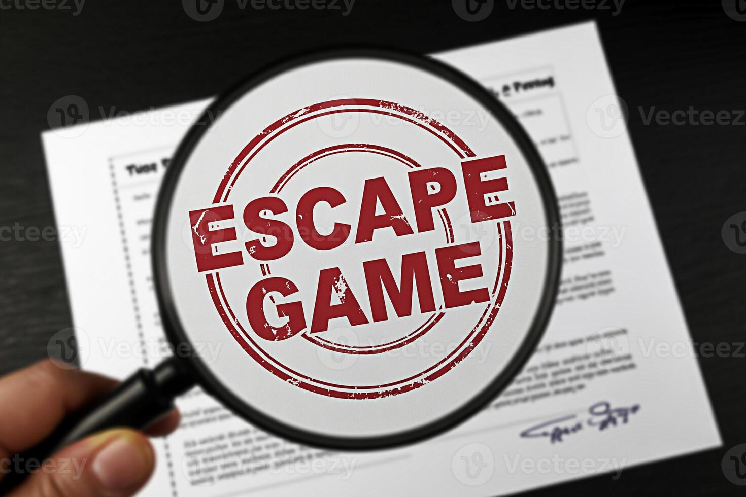 Hand Holding Magnifying Glass Over Document with Escape Game Stamp on a Dark Wooden Table symbolizing the challenge of solving puzzles and finding solutions in a mysterious and engaging environment Pro Photo