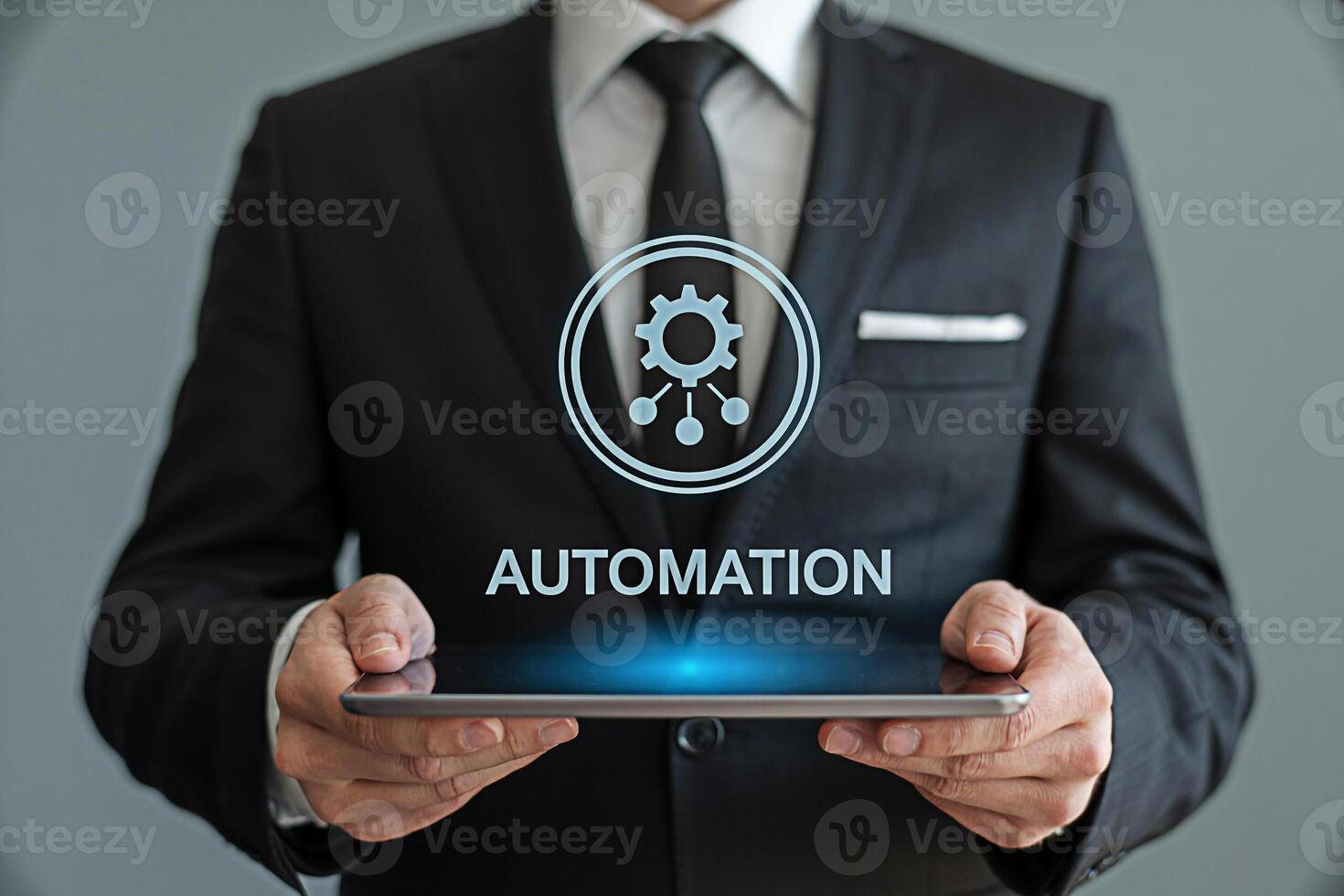 Sophisticated businessman in a suit holding a tablet displaying an automation icon in a corporate setting symbolizing efficiency and technological advancement in modern business operations Pro Photo