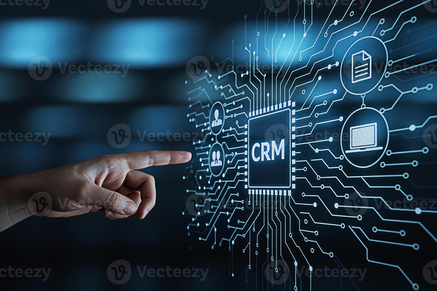 Human hand interacting with a digital CRM interface in a modern tech environment highlighting customer relationship management and technological advancement with a futuristic and innovative feel Pro Photo