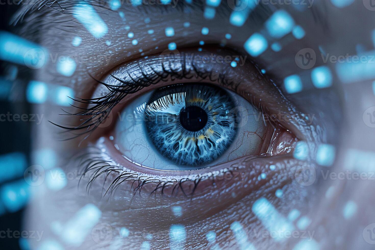 Closeup of a human eye reflecting digital data streams in a futuristic setting conveying a sense of technological advancement artificial intelligence and the integration of technology with human perce Pro Photo