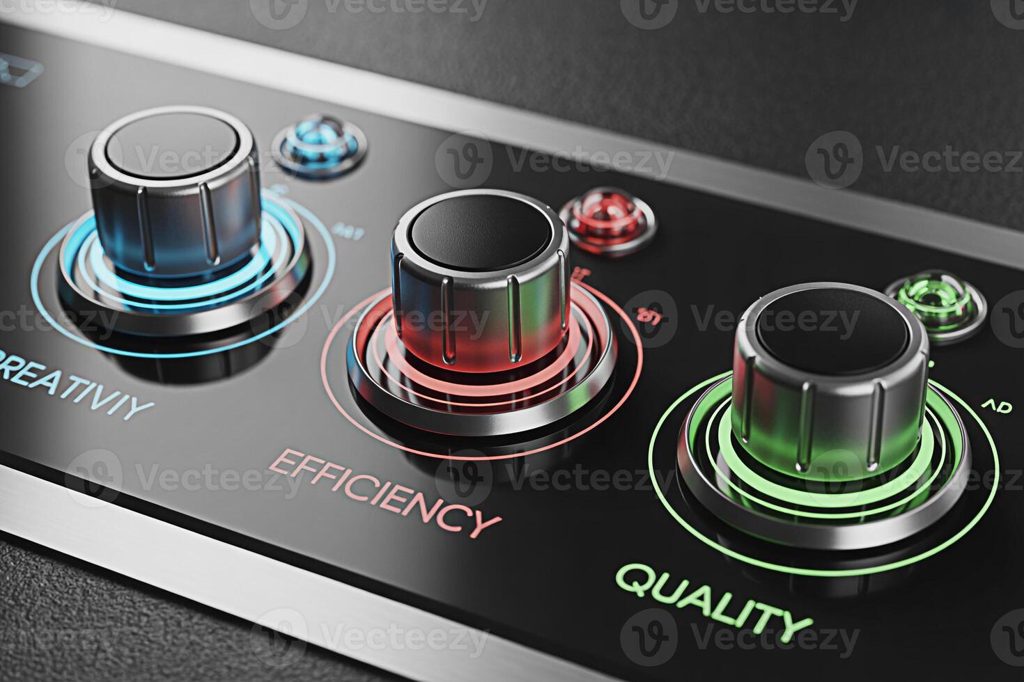 Illuminated control panel displaying creativity efficiency and quality in a modern setting symbolizing optimization and balance for business success and innovative solutions showcasing a futuristic an Pro Photo