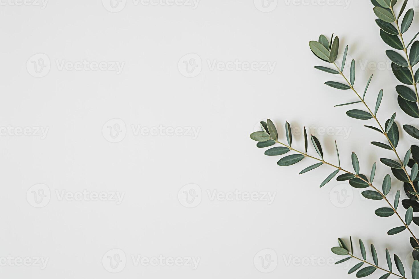 Eucalyptus branches arranged elegantly on a clean white surface creating a minimalist and calming botanical composition perfect for conveying a sense of natural beauty and serene simplicity in design Pro Photo