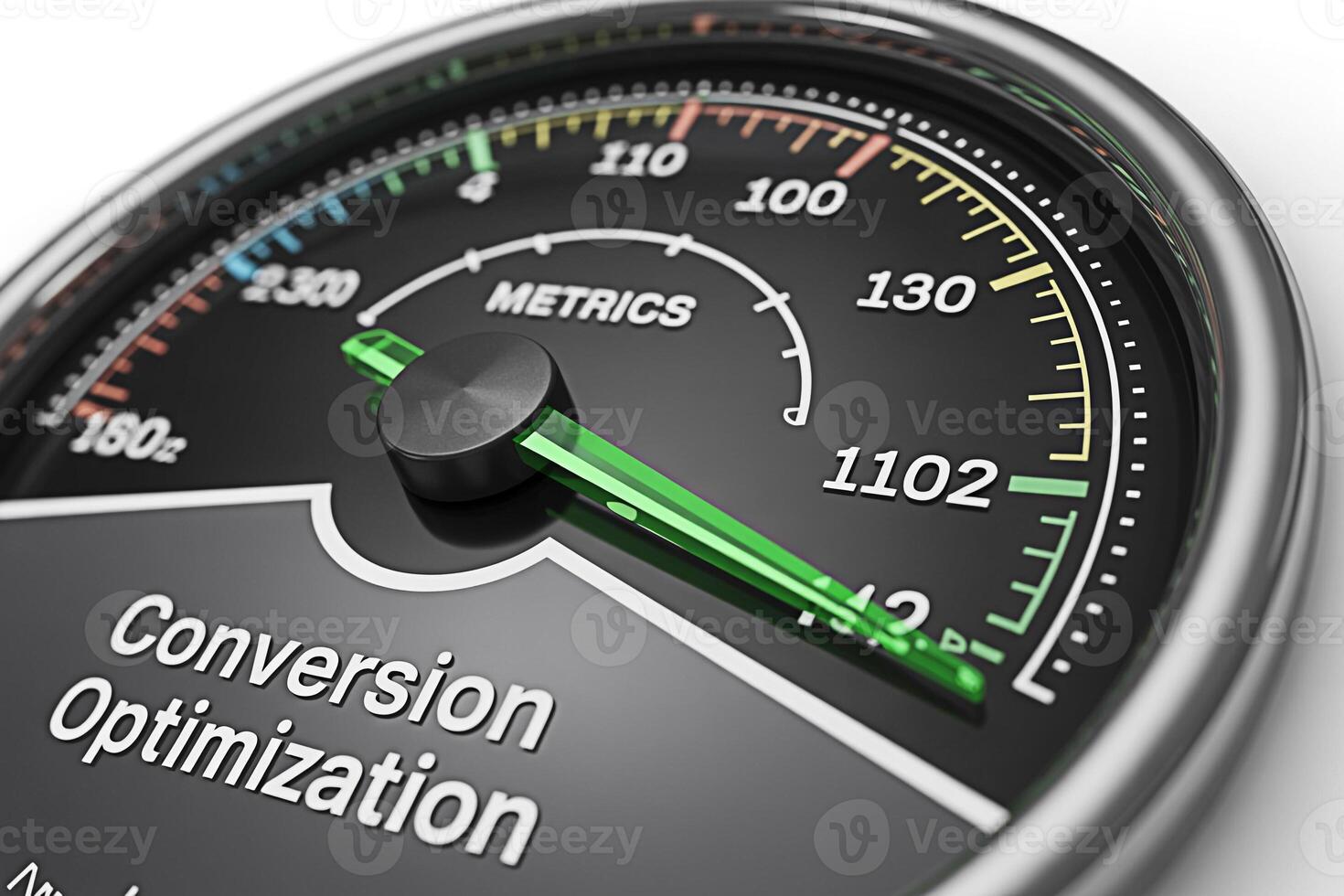 Closeup of a speedometer with a green needle indicating high performance in conversion optimization showcasing metrics and progress in a business setting conveying a sense of achievement and efficienc Pro Photo