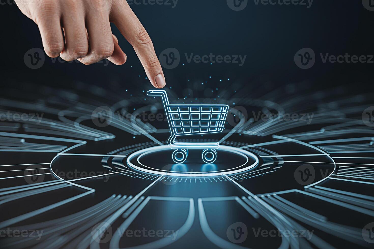 A hand interacts with a glowing shopping cart icon on a futuristic interface symbolizing online shopping and e-commerce in a digital environment representing convenience and technological advancement Pro Photo