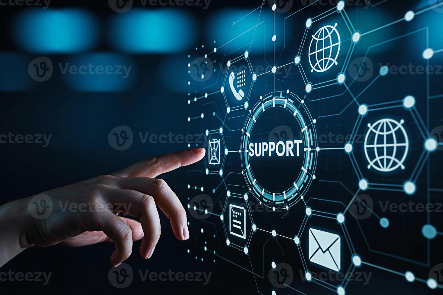 A finger interacts with a digital interface displaying the word SUPPORT surrounded by icons representing communication channels in a futuristic interconnected network conveying a sense of accessible a Pro Photo