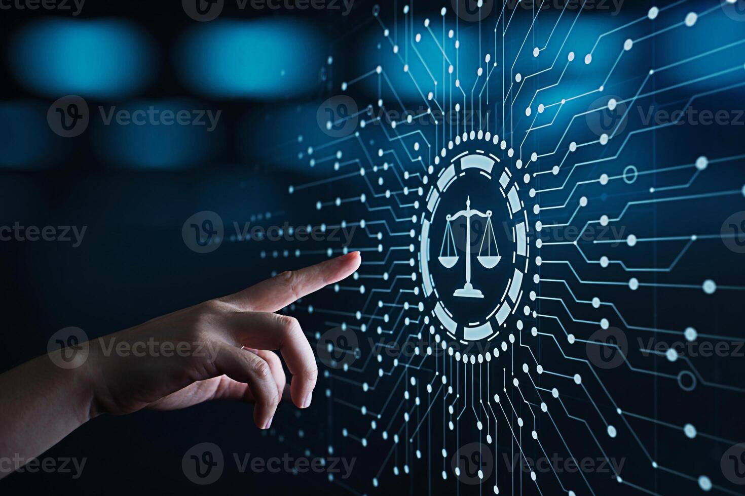 Finger interacting with a digital interface displaying scales of justice in a futuristic setting representing digital law legal technology and the intersection of justice and technology with a modern Pro Photo