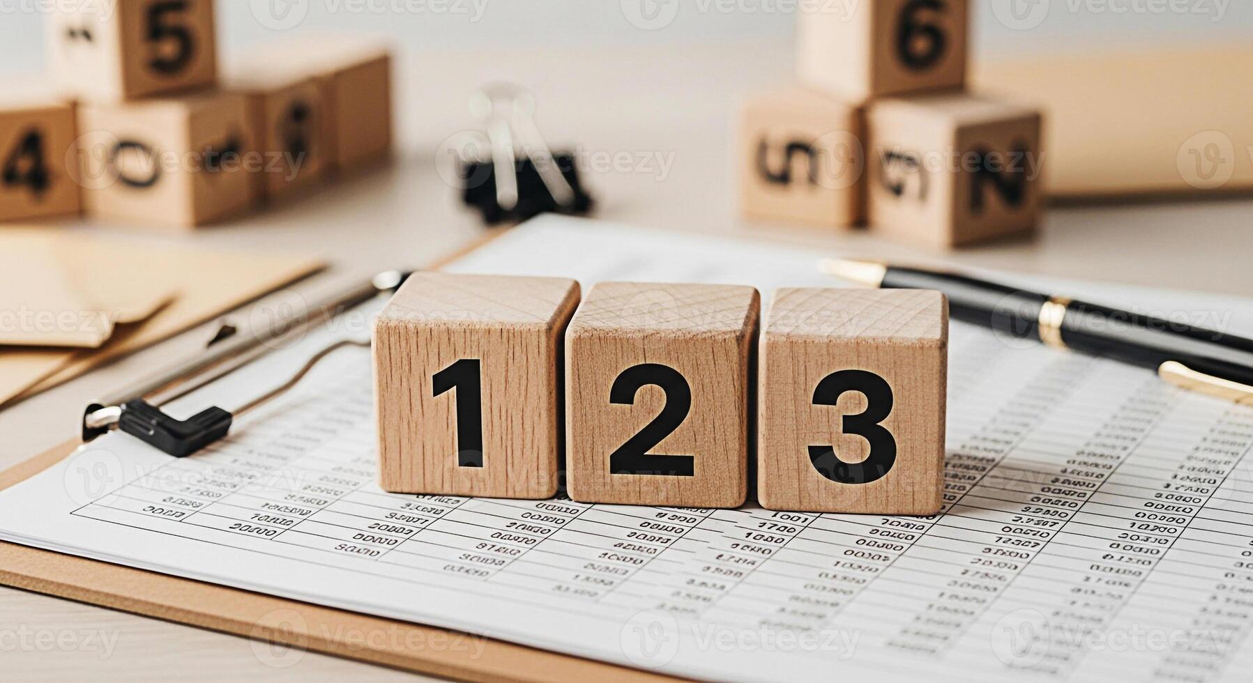 Wooden number blocks displaying 123 resting on a financial report in a bright office setting symbolizing accounting principles financial planning and basic numeracy for business success Pro Photo