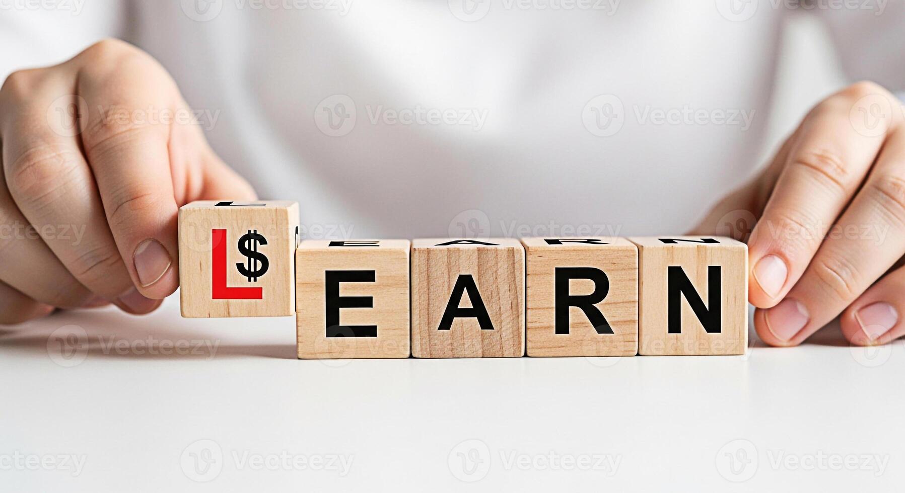 Person arranging wooden blocks spelling LEARN transforming it into EARN by replacing the L with a dollar sign symbolizing financial literacy and the concept of learning to earn in a bright minimalist Pro Photo