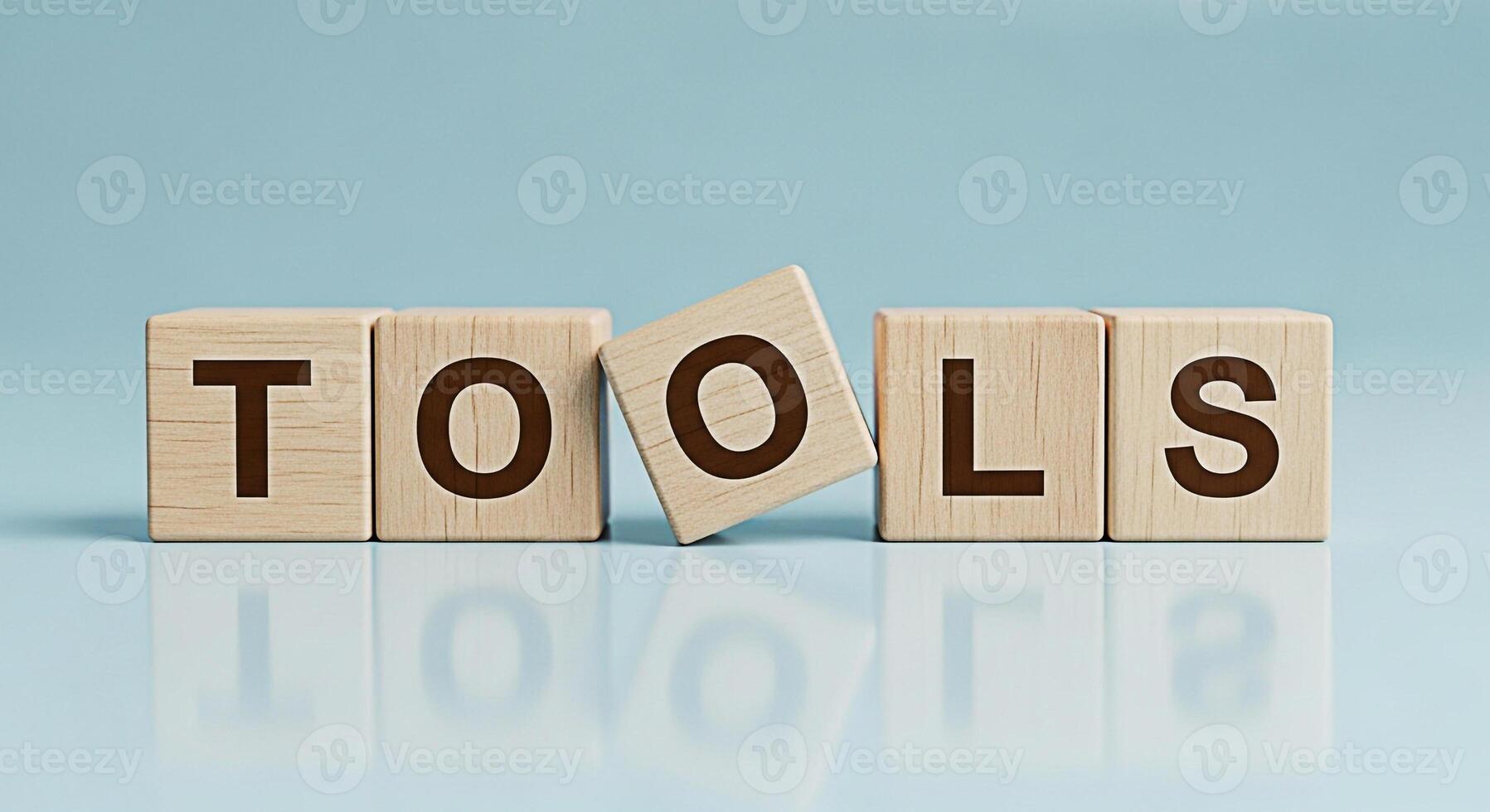 Wooden blocks spelling TOOLS on a reflective surface symbolizing resources and equipment in a studio setting conveying a message of utility readiness and the importance of having the right instruments Pro Photo