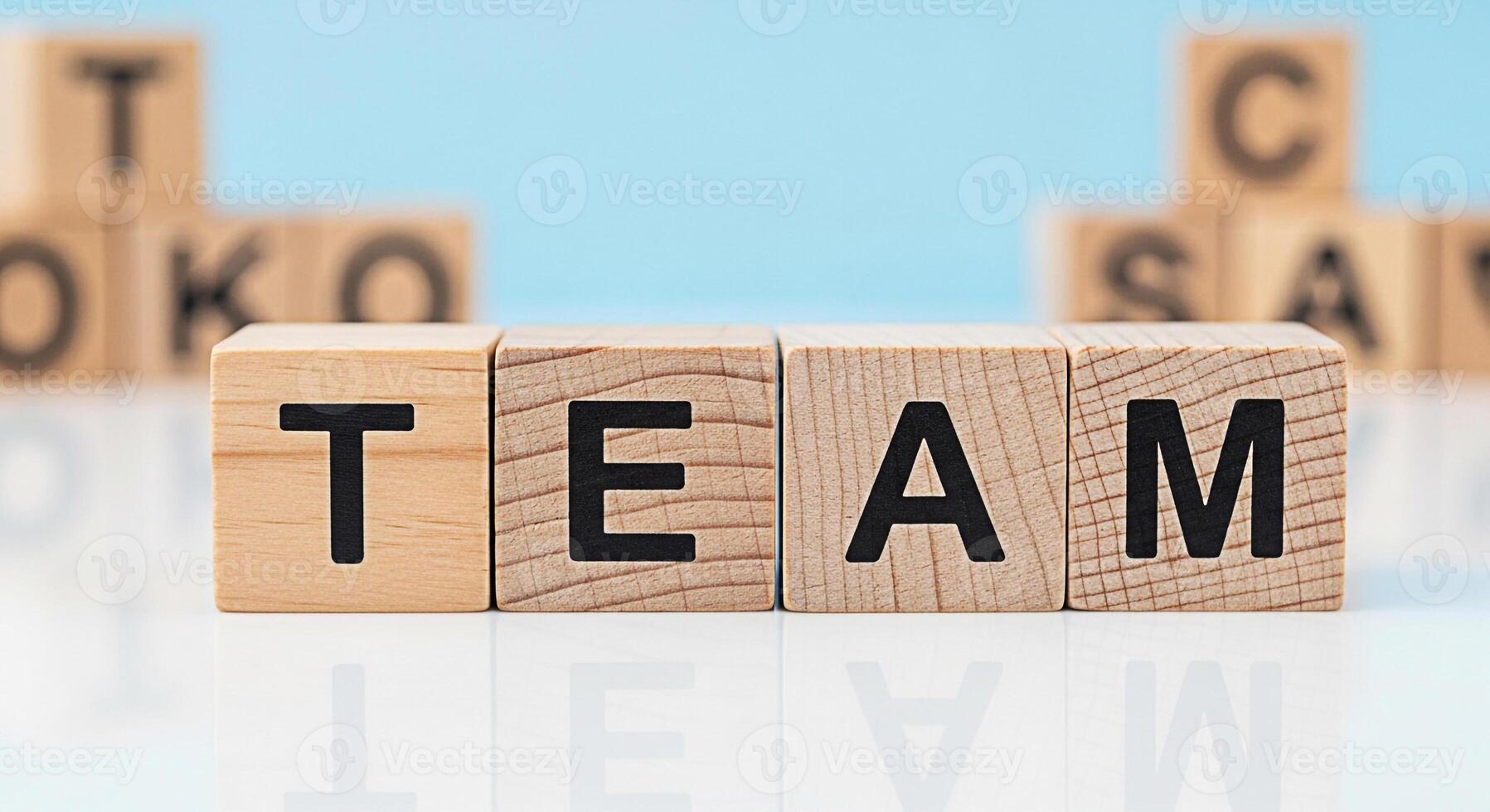 Wooden blocks spelling TEAM on a white surface against a light blue background symbolizing collaboration unity and the importance of teamwork in achieving common goals with a bright and optimistic moo Pro Photo