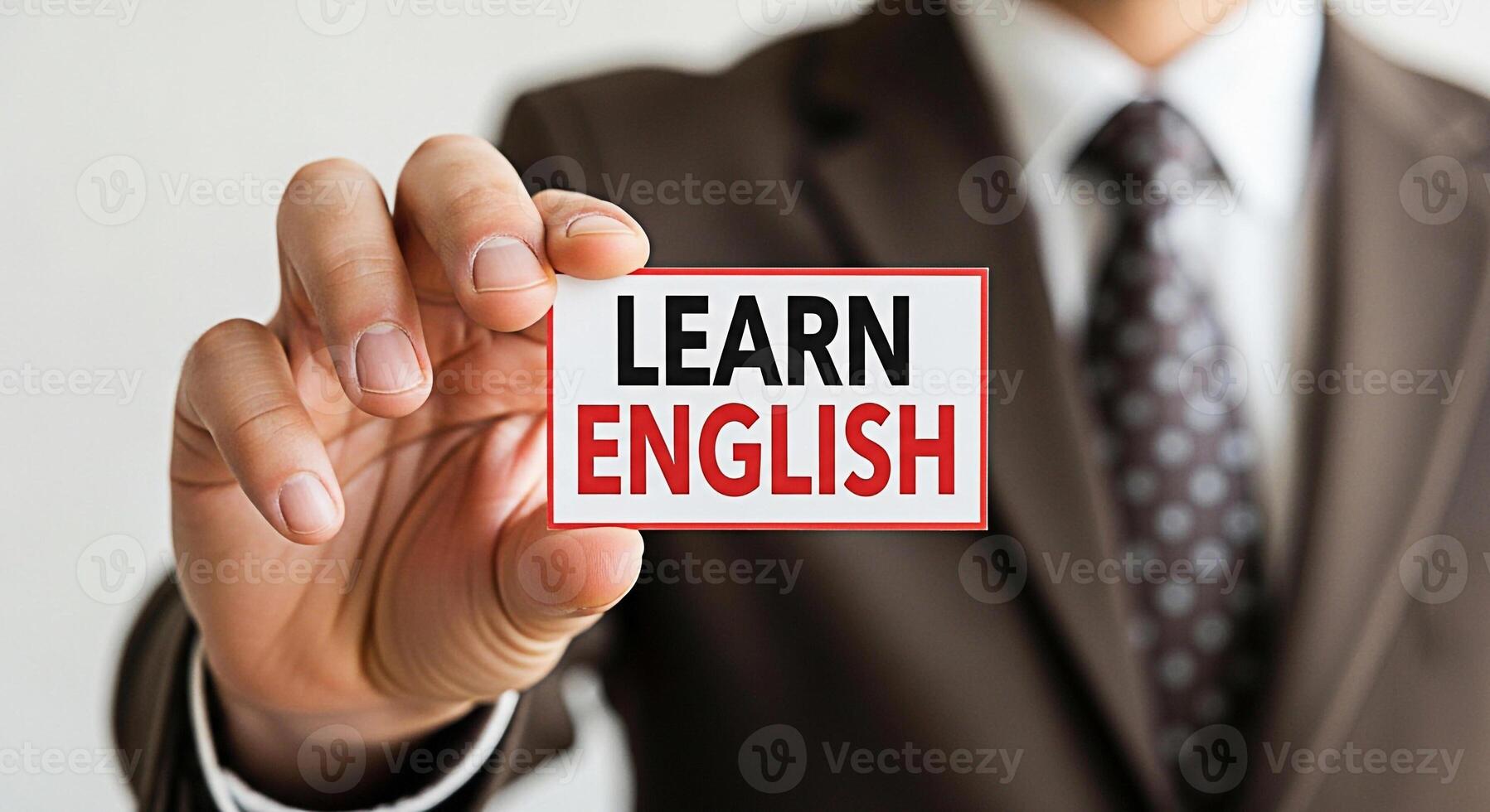 Welldressed businessman in a professional setting presenting a card that says Learn English emphasizing the importance of language acquisition and global communication skills for career advancement an Pro Photo
