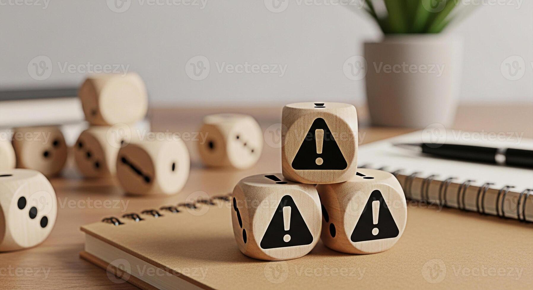 Wooden dice displaying warning signs stacked on a notebook in a bright modern office symbolizing risk assessment decisionmaking and the importance of identifying potential hazards in business and life Pro Photo