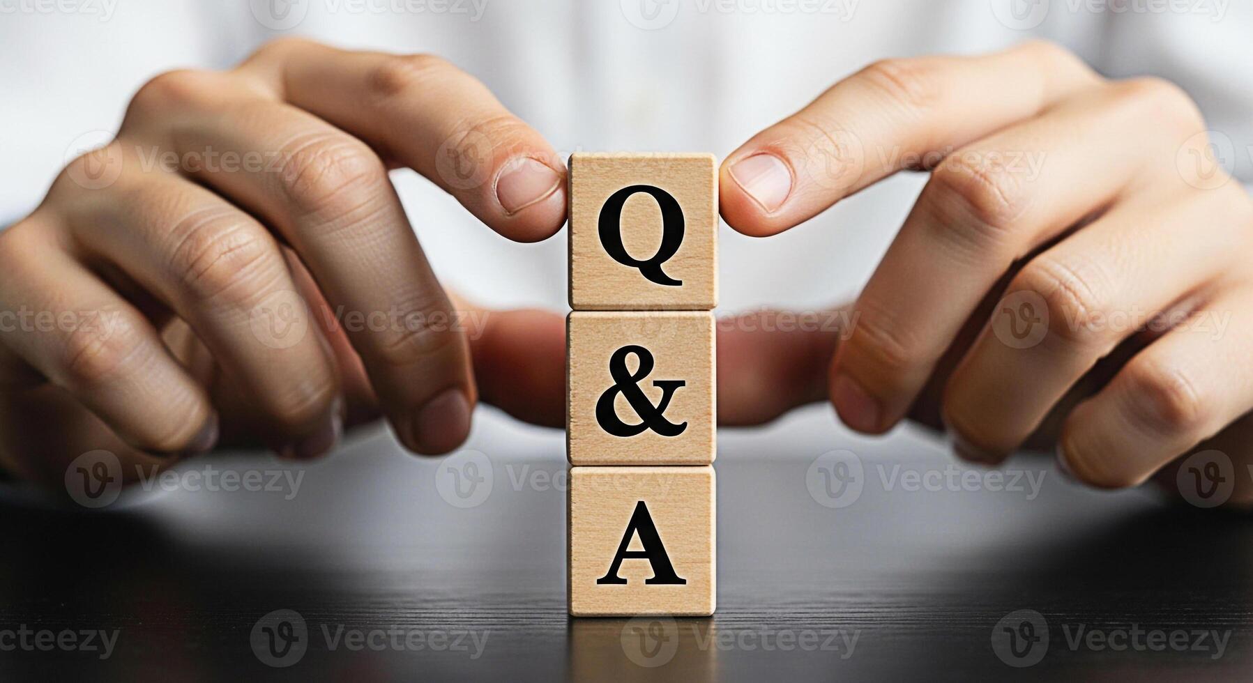 Person arranging wooden blocks with Q A on a dark surface representing questions and answers knowledge and information creating a sense of clarity and understanding in a business or educational settin Pro Photo