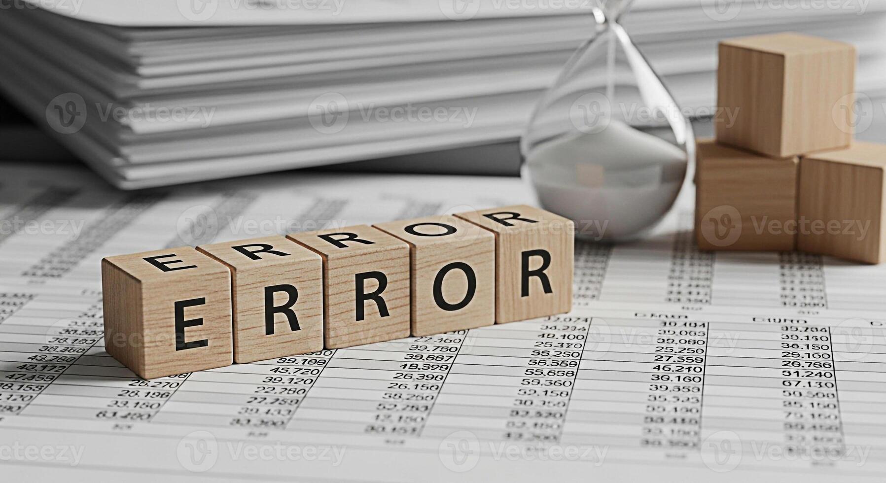 Wooden blocks spelling ERROR on financial document with hourglass and paper stack symbolizing mistakes in accounting and the importance of time management in preventing financial errors and promoting Pro Photo