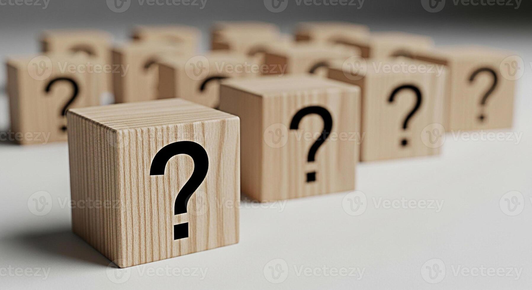 Wooden blocks displaying question marks on a neutral surface representing uncertainty and inquiry ideal for illustrating concepts of problemsolving decisionmaking and seeking answers with a minimalist Pro Photo
