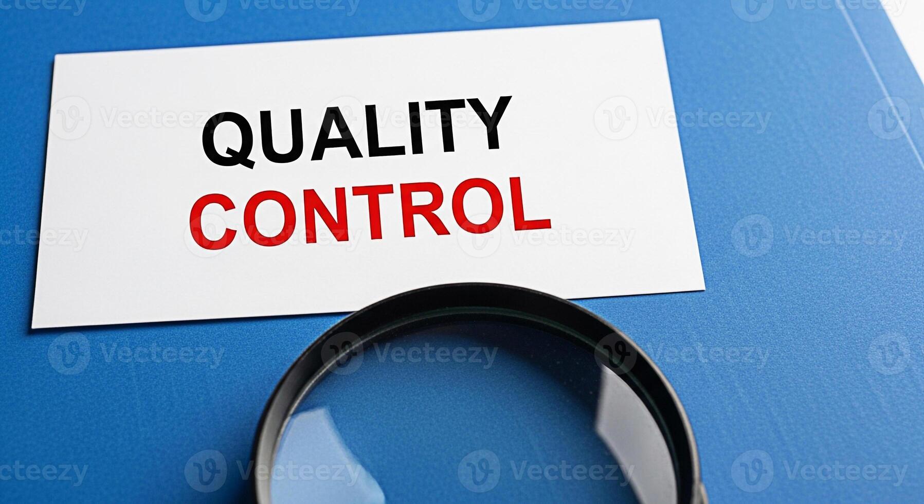 Closeup of a magnifying glass inspecting a Quality Control document on a blue textured surface emphasizing precision and attention to detail in business processes and ensuring high standards and accur Pro Photo