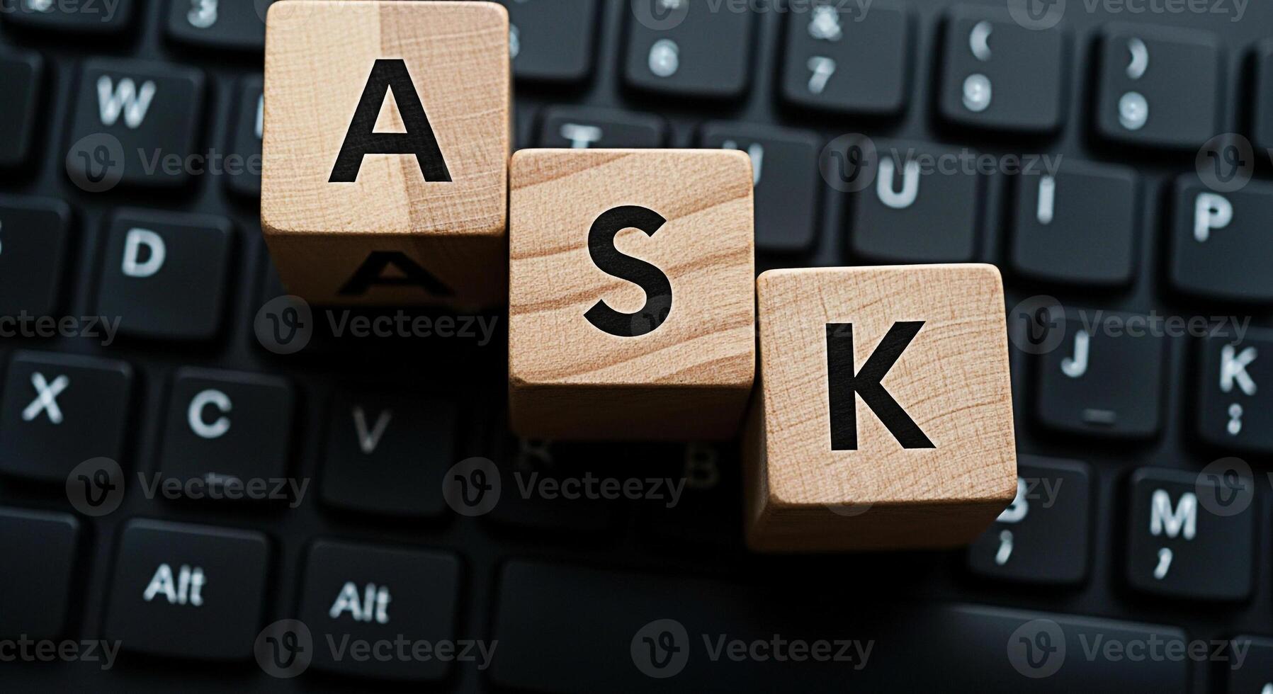 Wooden blocks spelling ASK on a black computer keyboard symbolizing questions and information seeking in a digital environment conveying a message of inquiry and problemsolving in the modern age Pro Photo