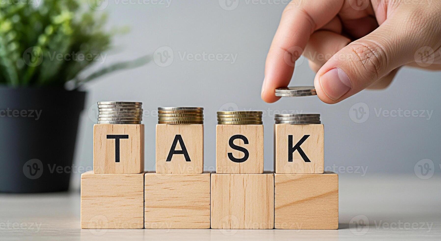 Human hand adding a coin to the stack on wooden blocks spelling TASK symbolizing investment and financial planning in a bright minimalist office setting representing growth and achievement Pro Photo