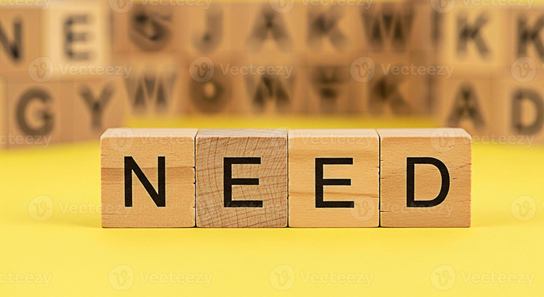 Wooden blocks spelling NEED on a bright yellow background conveying a sense of urgency and importance highlighting essential requirements and necessities in a simple impactful way emphasizing the conc Pro Photo