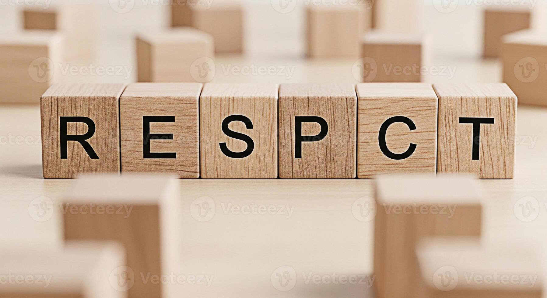Wooden blocks spelling RESPECT arranged on a light wooden surface surrounded by other blocks symbolizing core values ethical behavior and the importance of treating others with dignity and considerati Pro Photo