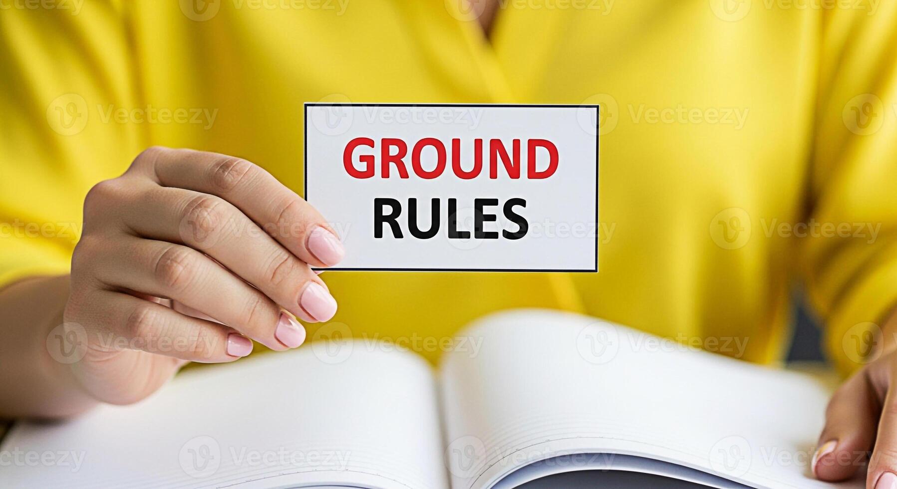 Woman holding a sign with the words Ground Rules in front of an open book emphasizing the importance of establishing guidelines and expectations in a learning or collaborative environment promoting cl Pro Photo