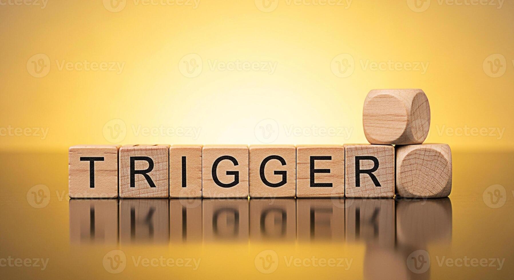 Wooden blocks spelling TRIGGER on a reflective surface against a golden gradient background representing a sensitive topic a catalyst for change or a psychological stimulus evoking feelings of awarene Pro Photo