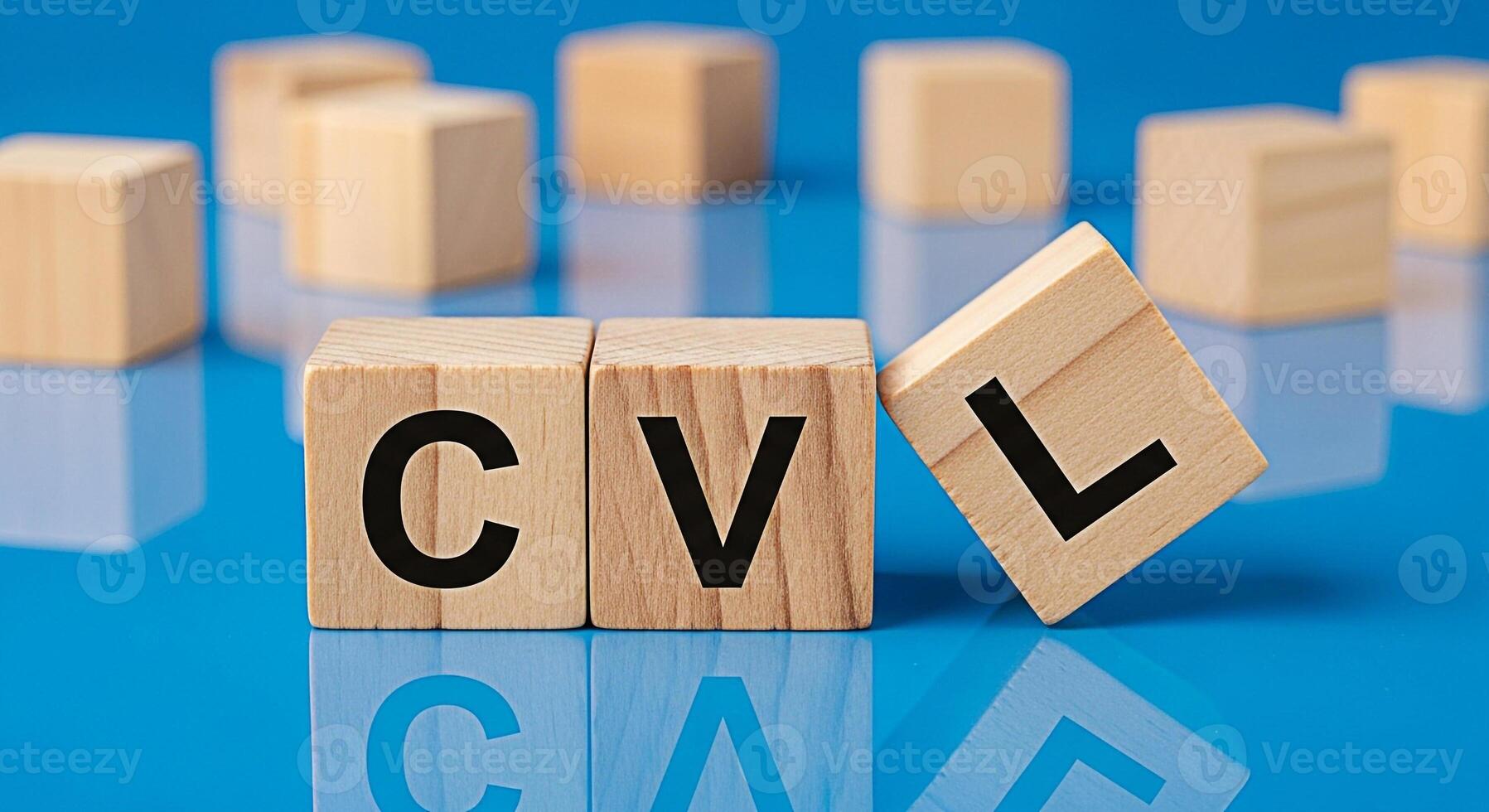 Wooden blocks spelling out CVL on a reflective blue surface representing career development and learning symbolizing professional growth and the importance of continuous skill enhancement in a competi Pro Photo