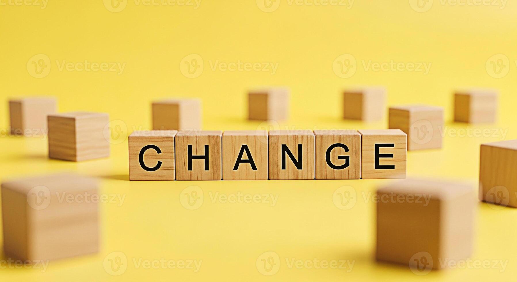 Wooden blocks spelling CHANGE on a bright yellow background symbolizing transformation and adaptation in a dynamic business environment conveying a message of progress and positive evolution Pro Photo