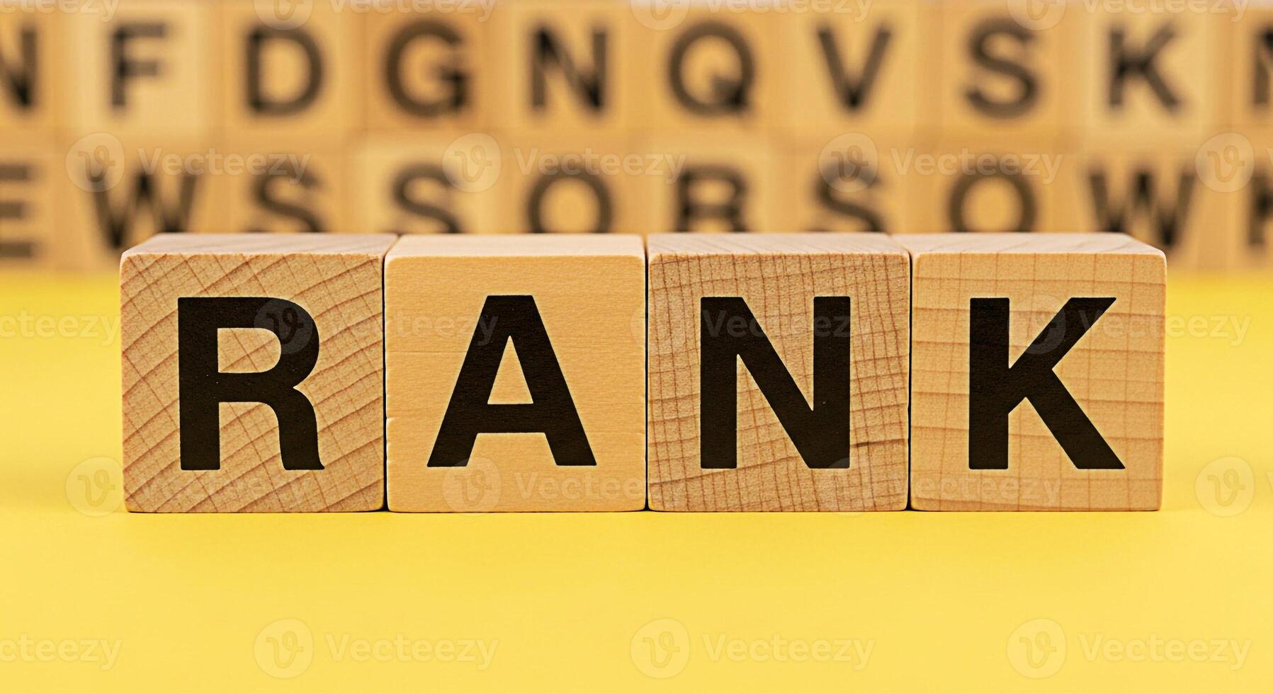 Wooden blocks displaying the word RANK on a bright yellow surface symbolizing achievement and success in a competitive environment conveying a sense of order and hierarchy in business and personal gro Pro Photo