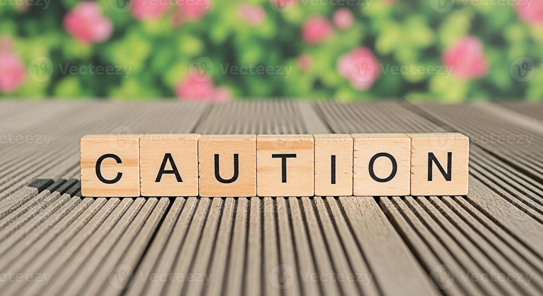 Wooden blocks spelling Caution on a wooden surface against a blurred floral background conveying a message of warning and safety awareness in a natural and serene setting emphasizing the importance of Pro Photo