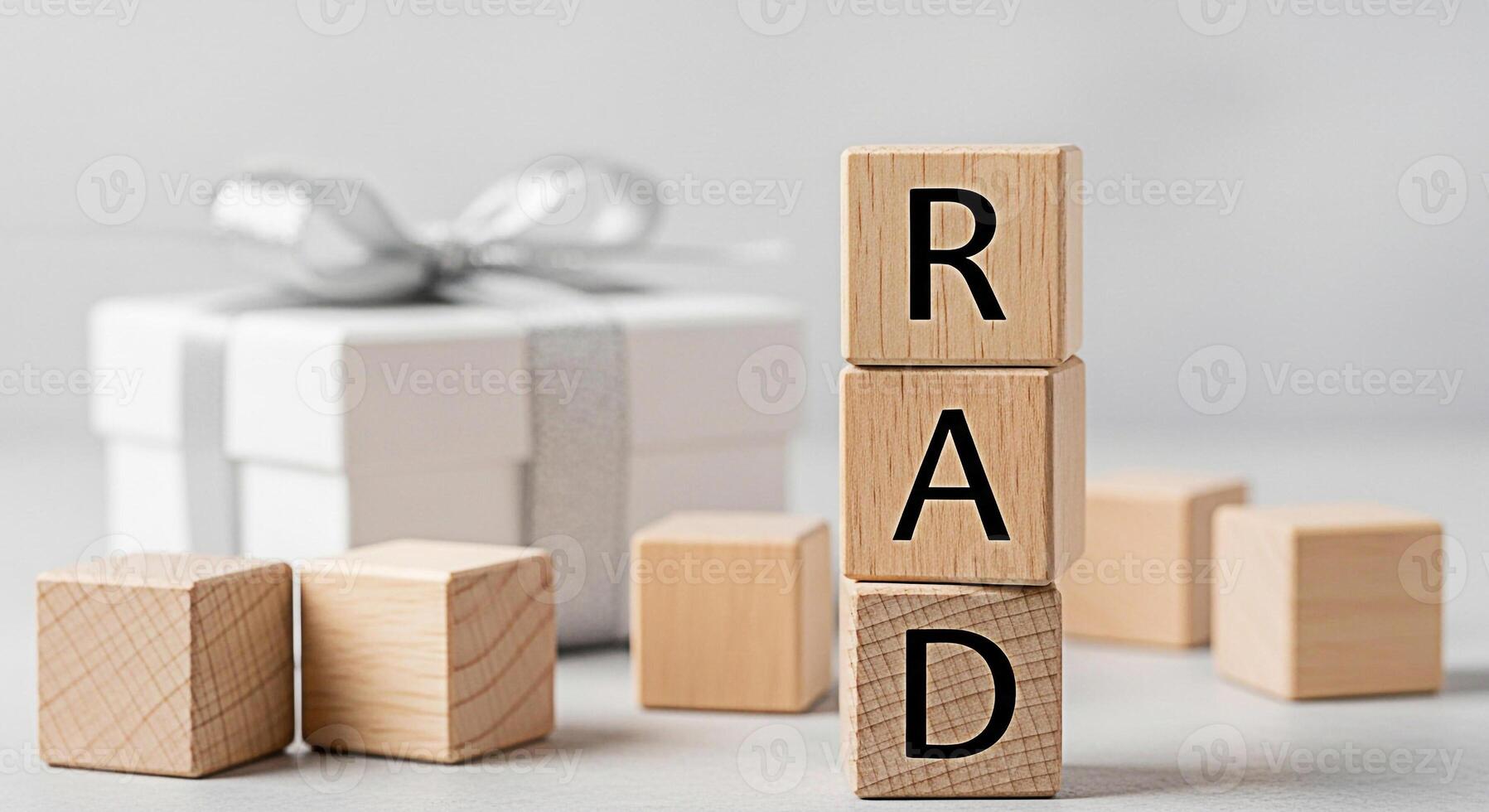 Stack of wooden blocks spelling RAD in a minimalist studio setting symbolizing positive vibes and a cool modern aesthetic with a gift box in the background perfect for lifestyle and motivational conte Pro Photo