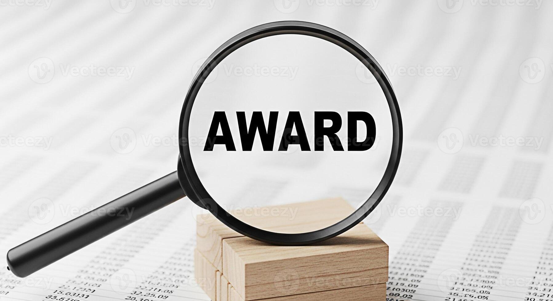 Magnifying glass focusing on the word Award on a financial document symbolizing achievement and recognition in a business environment highlighting success and the importance of performance measurement Pro Photo
