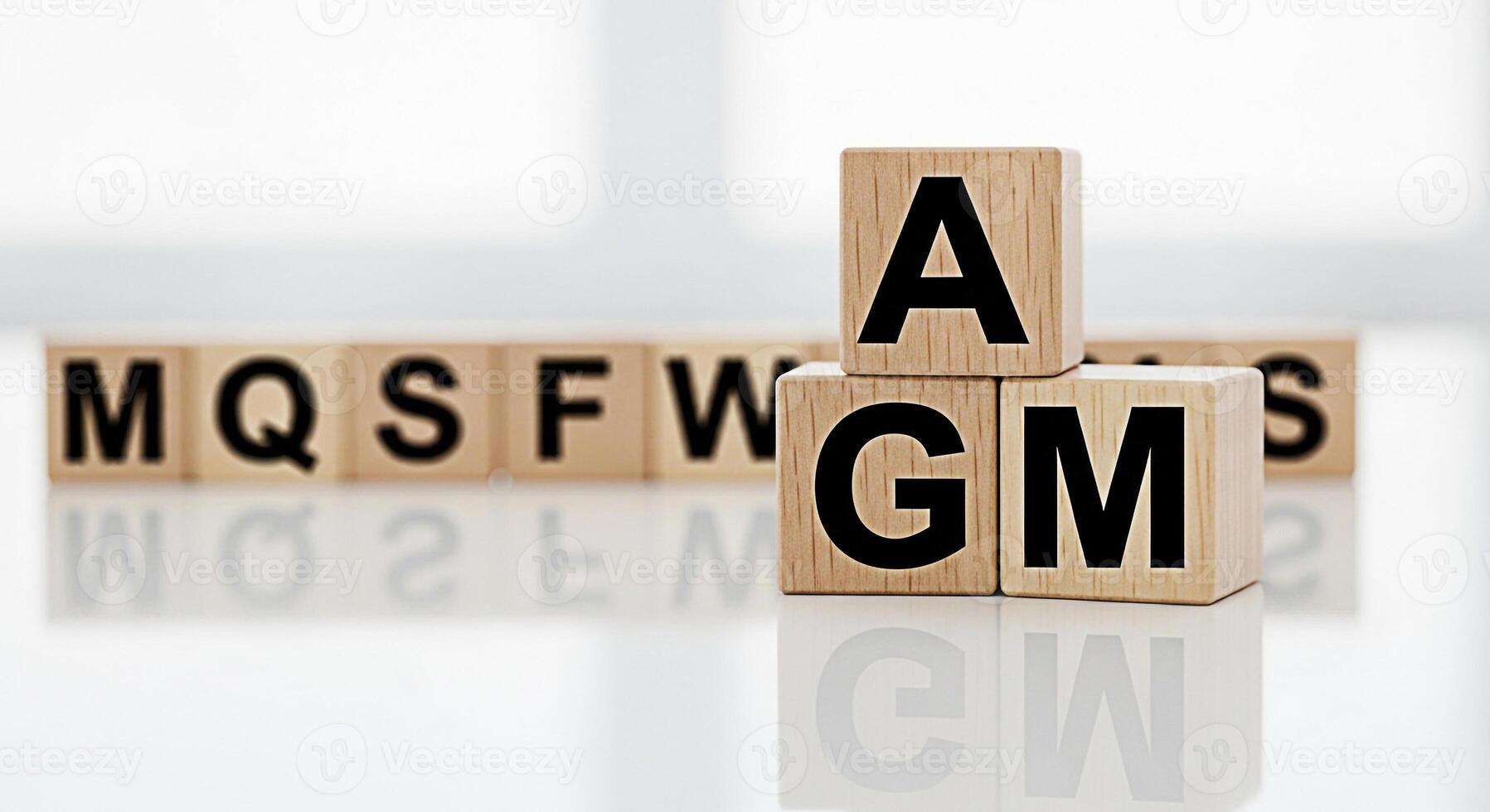 Wooden blocks spelling out AGM stacked on a reflective white surface with other blocks displaying random letters in the background conveying a sense of business meetings and corporate governance in a Pro Photo