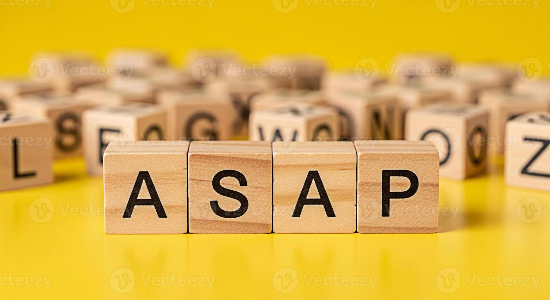 Wooden blocks spelling ASAP on a bright yellow surface conveying a sense of urgency and importance in a fastpaced business environment emphasizing the need for prompt action and efficient task managem Pro Photo
