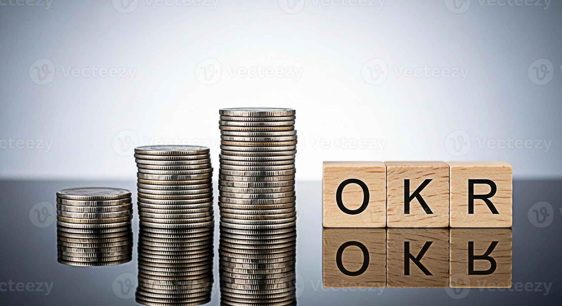 Stacks of coins progressively rising next to wooden blocks spelling OKR on a reflective surface symbolizing objectives and key results financial growth and business success in a minimalist setting Pro Photo