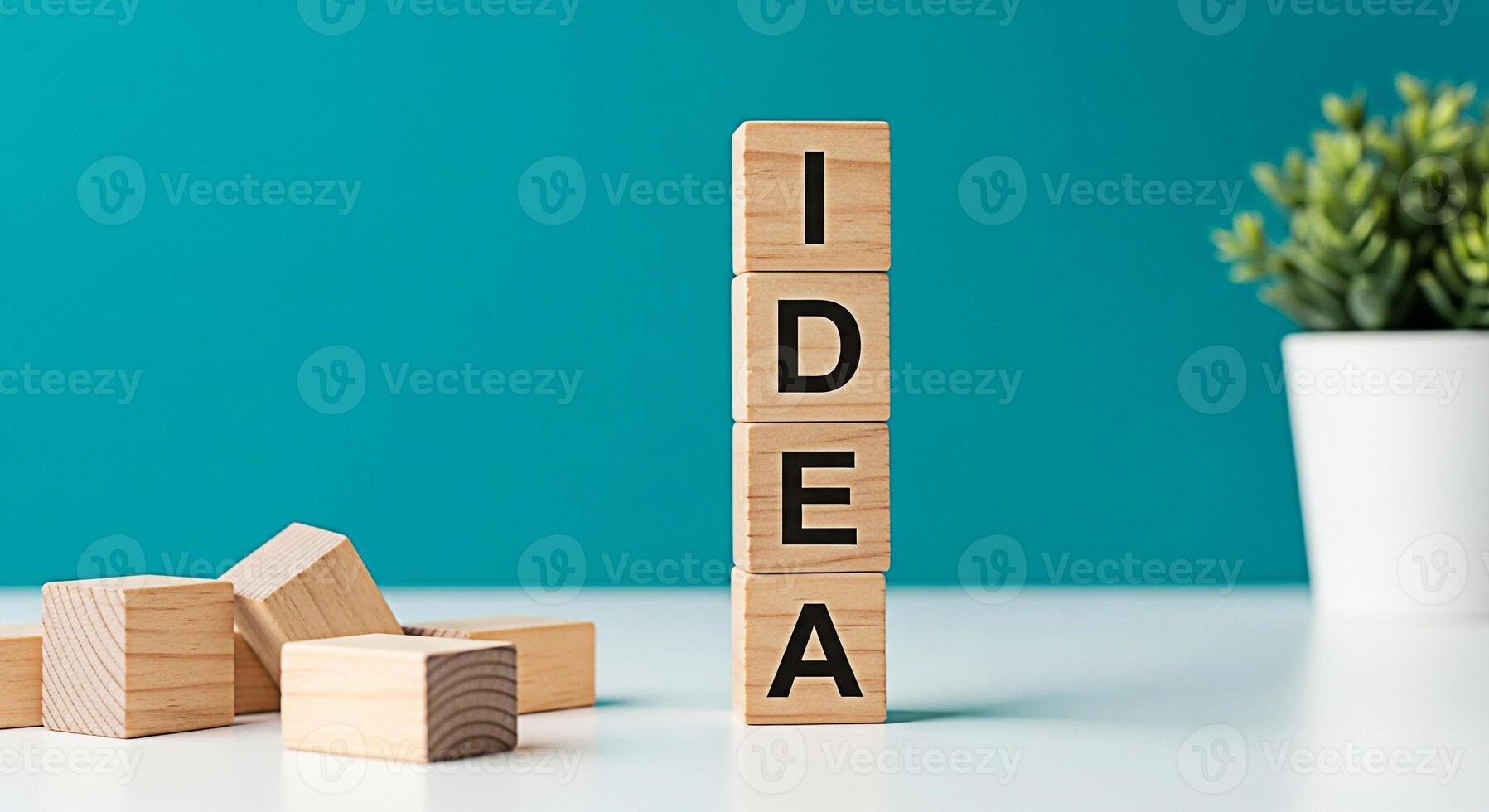 Stack of wooden blocks spelling IDEA on a white table against a teal background symbolizing creativity innovation and the generation of new concepts in a bright and inspiring workspace environment Pro Photo