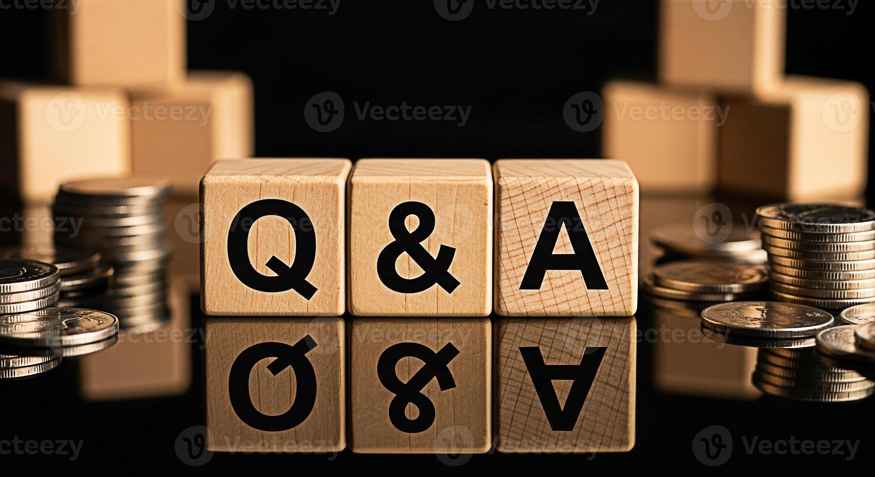 Wooden blocks displaying Q A with stacked coins on a reflective surface symbolizing financial questions and answers in a business setting creating a mood of clarity and informed decisionmaking Pro Photo