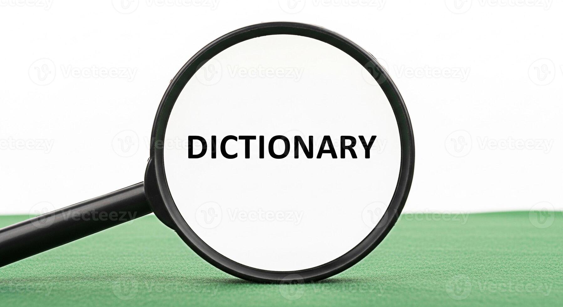 Magnifying glass focusing on the word Dictionary on a green surface symbolizing research and exploration of language and knowledge creating a sense of curiosity and discovery in a bright clean environ Pro Photo
