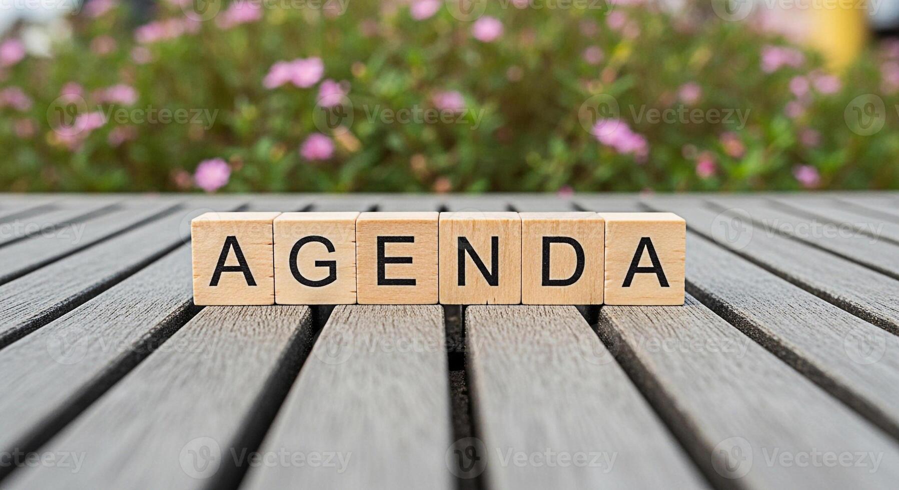 Wooden blocks spelling AGENDA displayed on a gray wooden table with a blurred background of pink flowers in a garden setting representing organization planning and a structured approach to tasks and m Pro Photo
