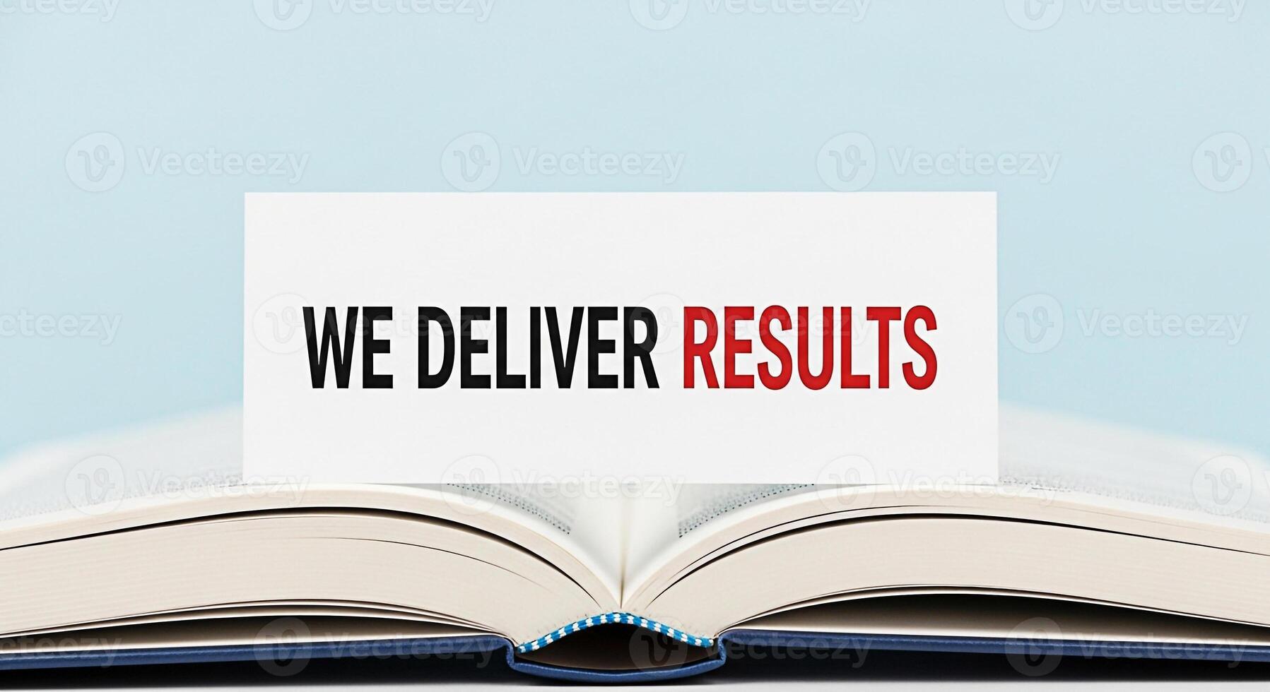 Open book displaying a card with the message We Deliver Results against a light blue background symbolizing success achievement and the power of knowledge to drive positive outcomes in business and pe Pro Photo