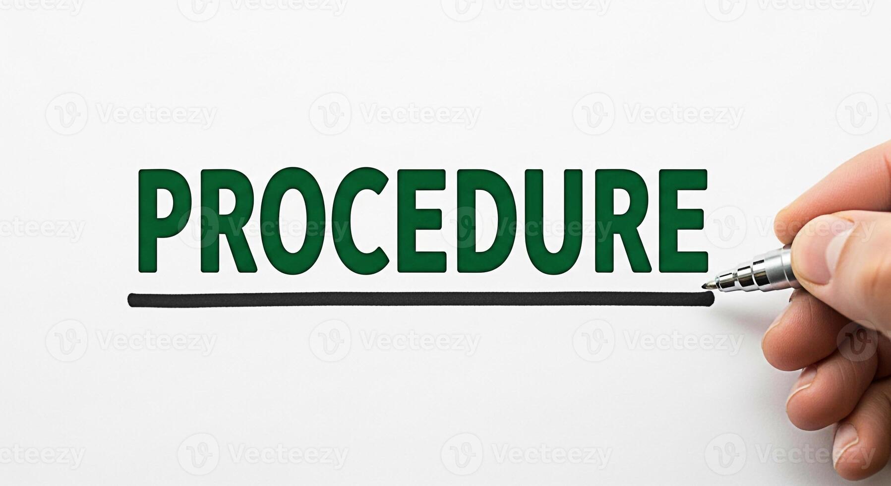 Hand underlining the word Procedure in bold green letters on a white background emphasizing a structured process and clear guidelines for achieving a specific goal with precision and accuracy Pro Photo