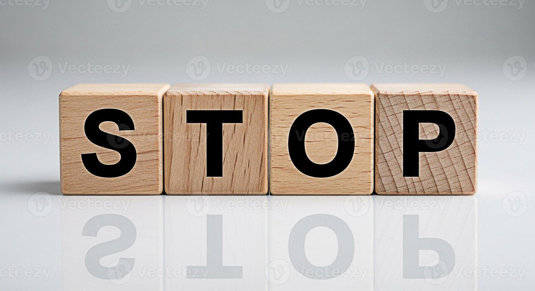 Wooden blocks spelling out STOP on a reflective surface conveying a message of caution and prevention in a clean minimalist setting emphasizing the importance of halting actions for safety and awarene Pro Photo