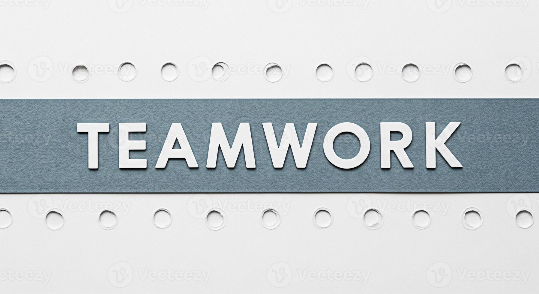 The word Teamwork displayed in white letters on a gray banner against a white background with evenly spaced holes symbolizing collaboration unity and the importance of working together effectively Pro Photo
