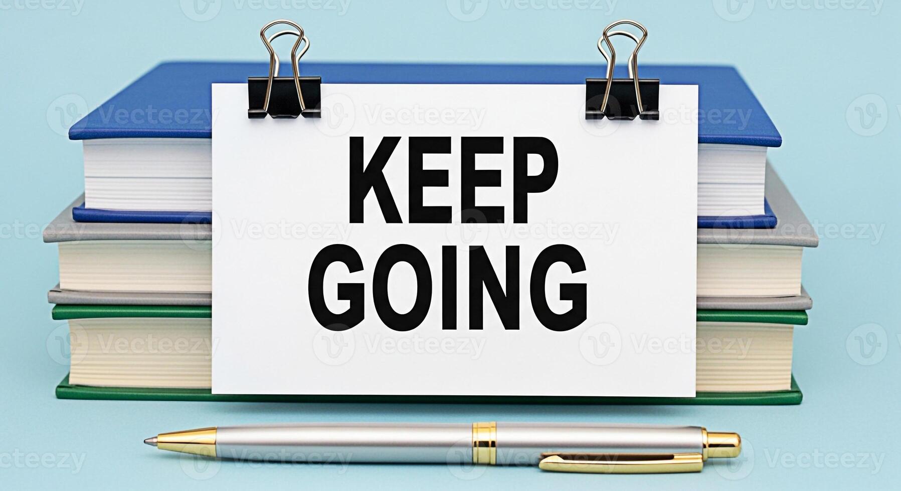 Stack of colorful books displaying a motivational message Keep Going on a white card with binder clips alongside a sleek silver pen on a light blue surface conveying a message of perseverance and enco Pro Photo
