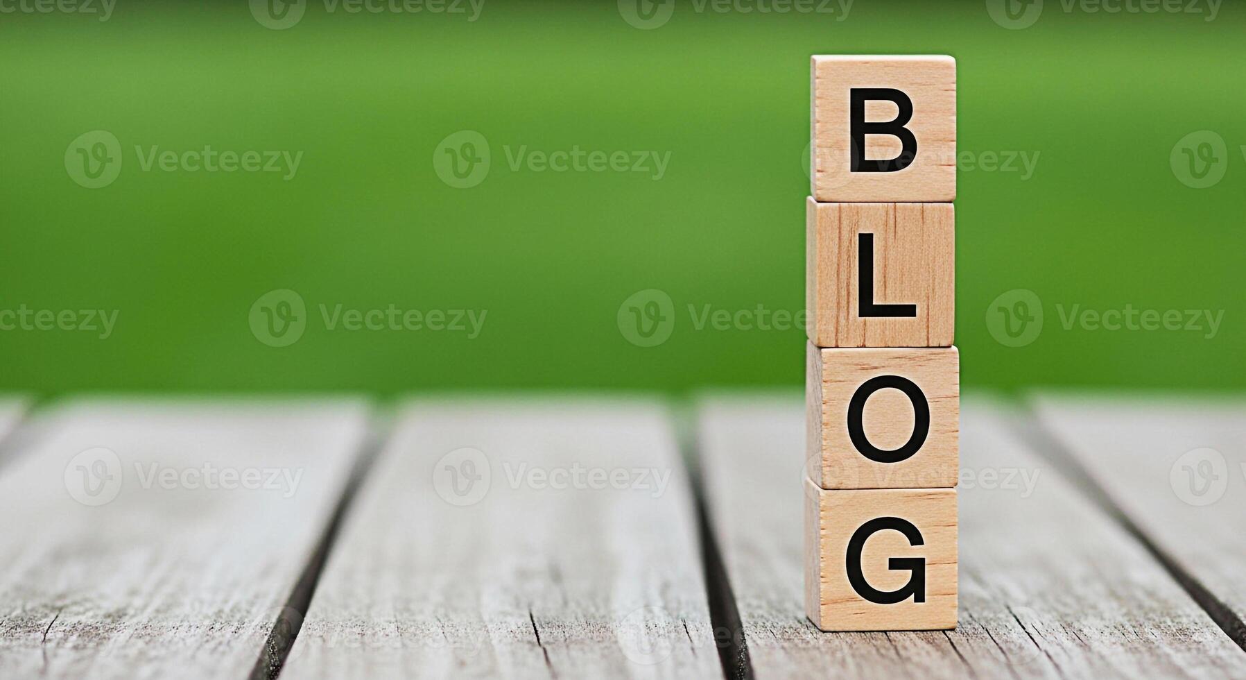 Wooden blocks spelling out BLOG on a rustic wooden table against a vibrant green background representing the concept of online content creation communication and the importance of blogging in the digi Pro Photo