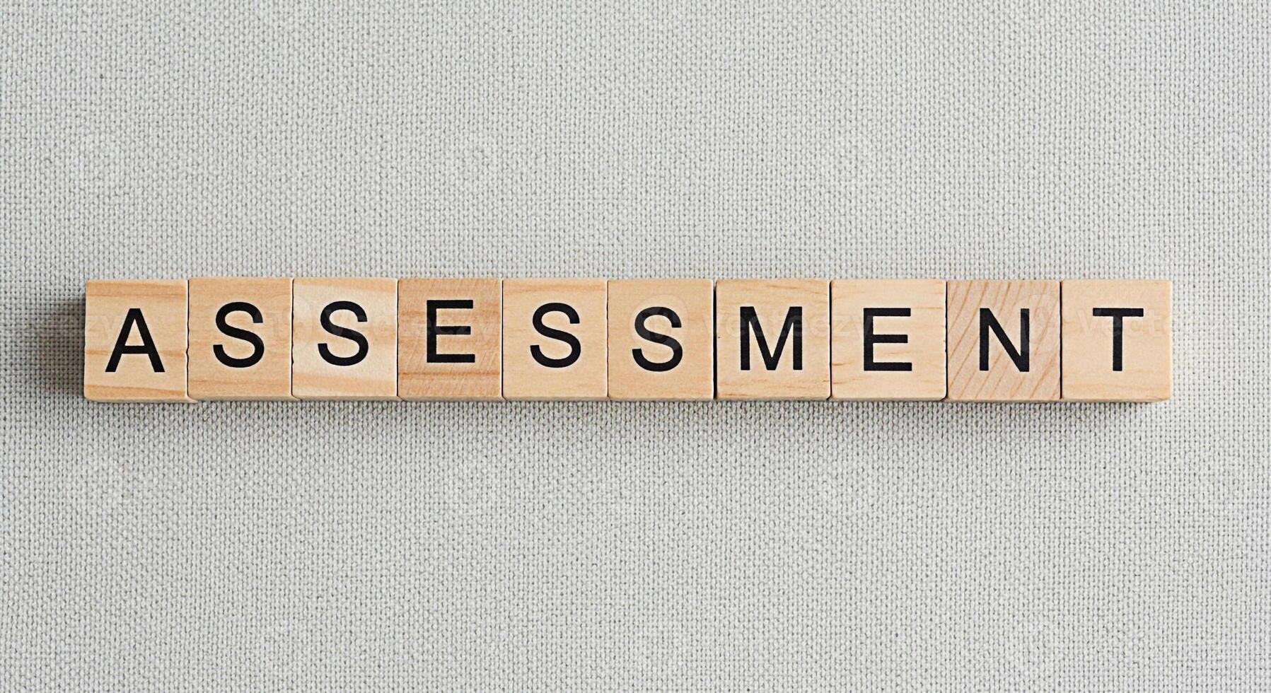 Wooden blocks spelling Assessment on a textured gray surface conveying the importance of evaluation and analysis in a neutral and professional setting emphasizing accuracy and thoroughness Pro Photo