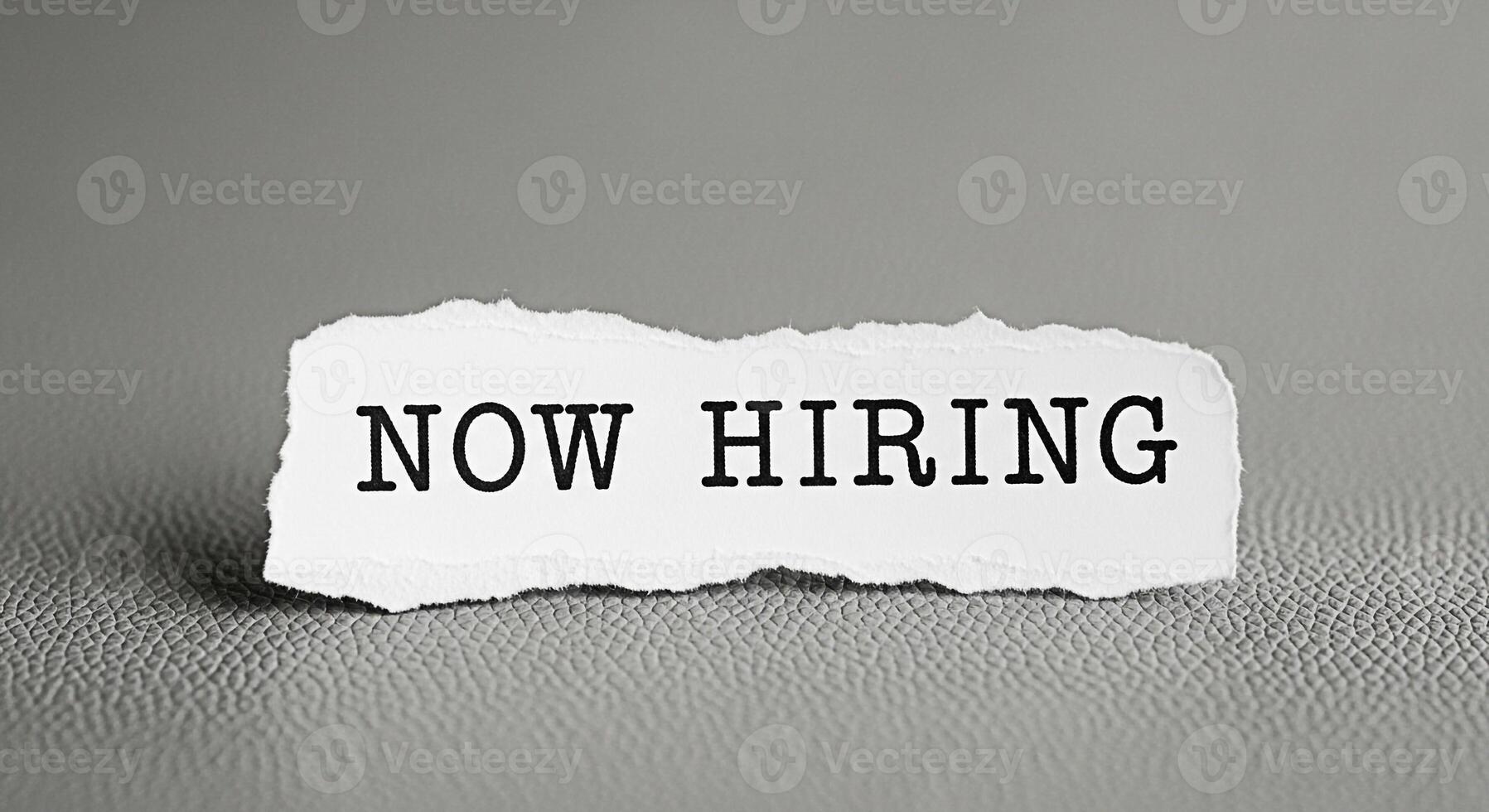 Torn paper piece displaying the message Now Hiring on a textured gray background symbolizing job opportunities and recruitment efforts creating a sense of urgency and new beginnings for potential cand Pro Photo