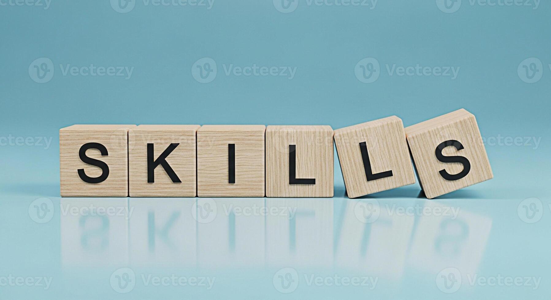 Wooden blocks spelling out SKILLS on a light blue surface representing the importance of learning and development in a minimalist and clean setting conveying a message of growth and competence Pro Photo